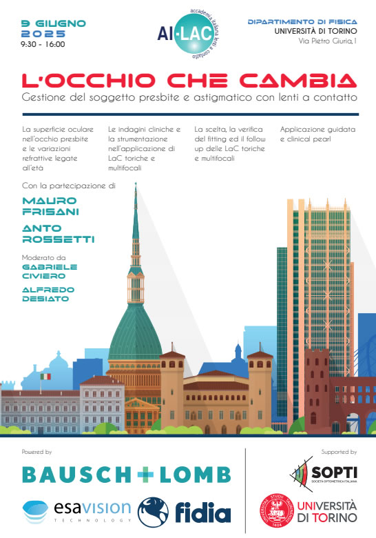 Si è svolto a Torino il corso di aggiornamento “l’occhio che cambia”, con attenzione al soggetto presbite e astigmatico con lenti a contatto. Grazie al dipartimento di fisica dell’Università per averci accolto, agli sponsor BAUSCH & LOMB, ESAVISION e OPTOX e a tutti i partecipanti per l’interesse dimostrato in un clima di dibattito e scambio di idee .